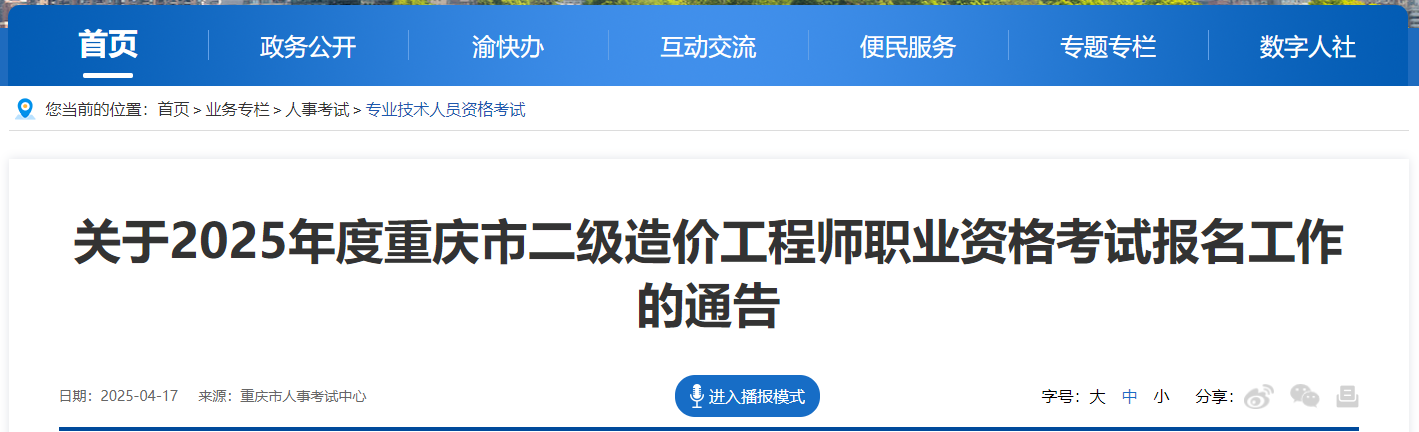 关于2025年度重庆市二级造价工程师职业资格考试报名工作的通告