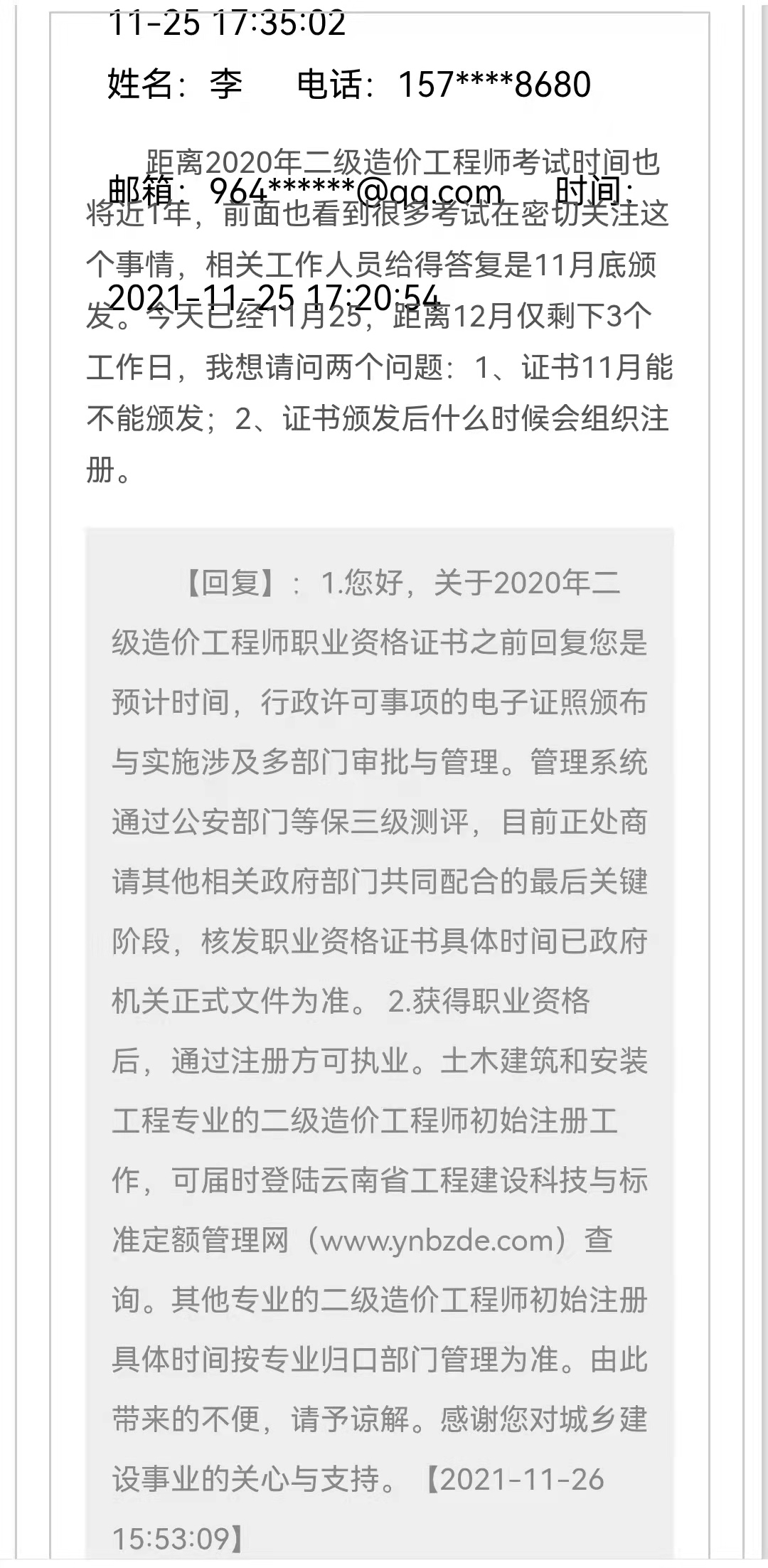 云南的小伙伴应该一直在等云南2020年二级造价师证书发放,考试都过去一年了,2021年还有1个月就过去,证书却迟迟还未到手;这不,小编就带着最新消息来了。但关于具体发证日期,官方也没给具体的回复,但有消息总比没消息好。