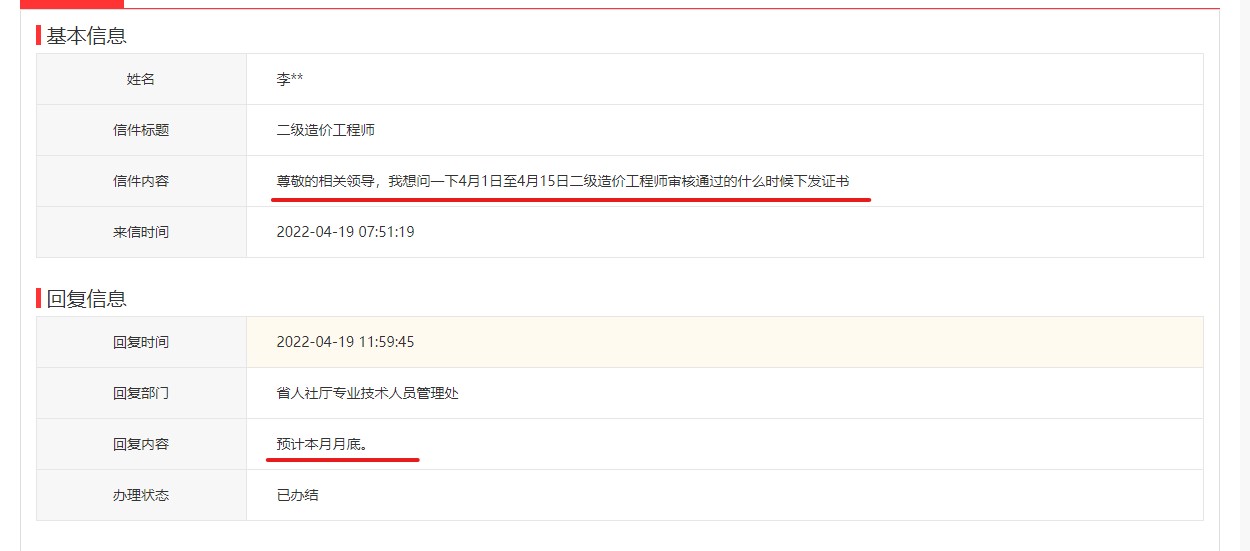 考生提问:尊敬的相关领导,我想问一下4月1日至4月15日二级造价工程师审核通过的什么时候下发证书