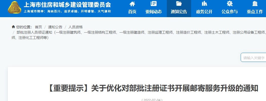为降低新冠肺炎疫情传播风险,有效减少人员聚集,阻断疫情传播,上海市住房和城乡建设管理委员会行政服务中心(以下简称市住房城乡建设管理委行政服务中心)对部批注册证书邮寄服务进一步优化完善。现通知如下: