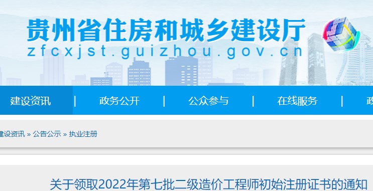 即日起请持单位公函(注册人本人来领取的,请持注册人身份证原件、复印件)及注册人2寸照片一张,到贵州省政务服务中心领取贵州省住房和城乡建设厅网站公告的2022年第七批二级造价工程师初始注册证书。