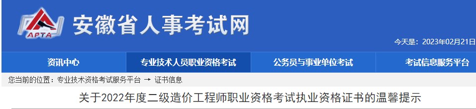 安徽省发布了2022年二级造价师执业资格证书发放的提示,二造证书已经发往各市,等各市抽查工作结束后方可发证。通知原文如下。