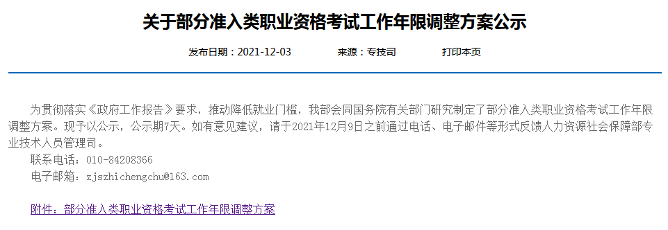 重磅!人社部发布关于降低或取消准入类职业资格考试工作年限要求的通知
