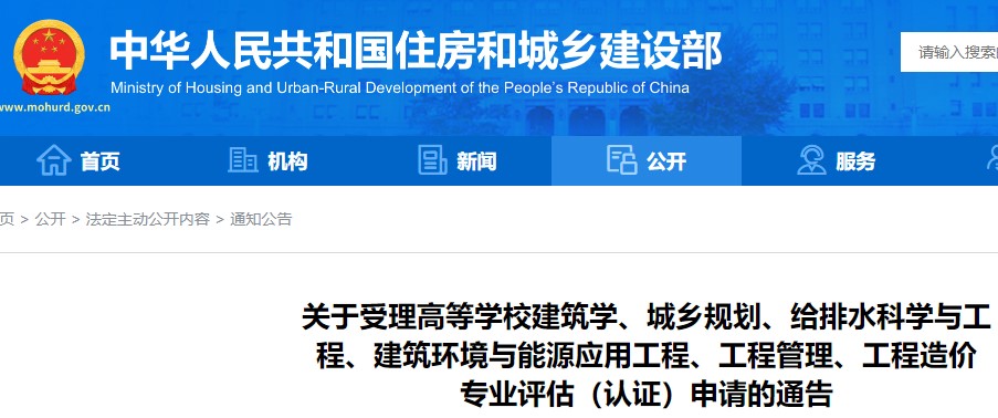 住建部关于受理高等学校工程造价 专业评估(认证)申请的通告