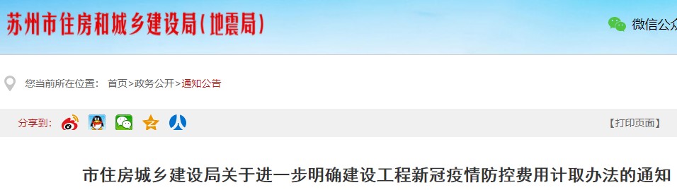 苏州住建局关于进一步明确建设工程新冠疫情防控费用计取办法的通知