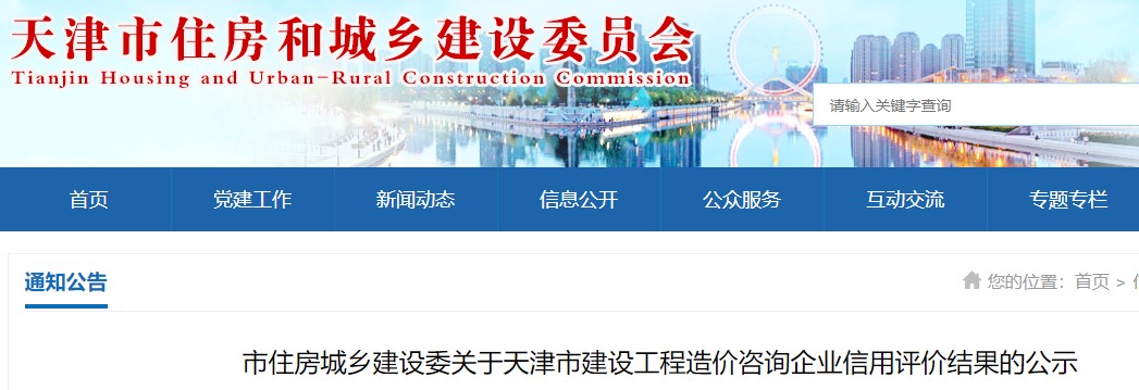 天津市住建委关于天津市建设工程造价咨询企业信用评价结果的公示