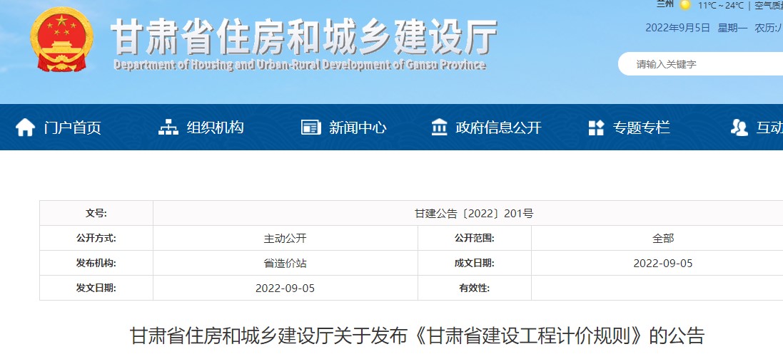 甘肃省住房和城乡建设厅关于发布《甘肃省建设工程计价规则》的公告