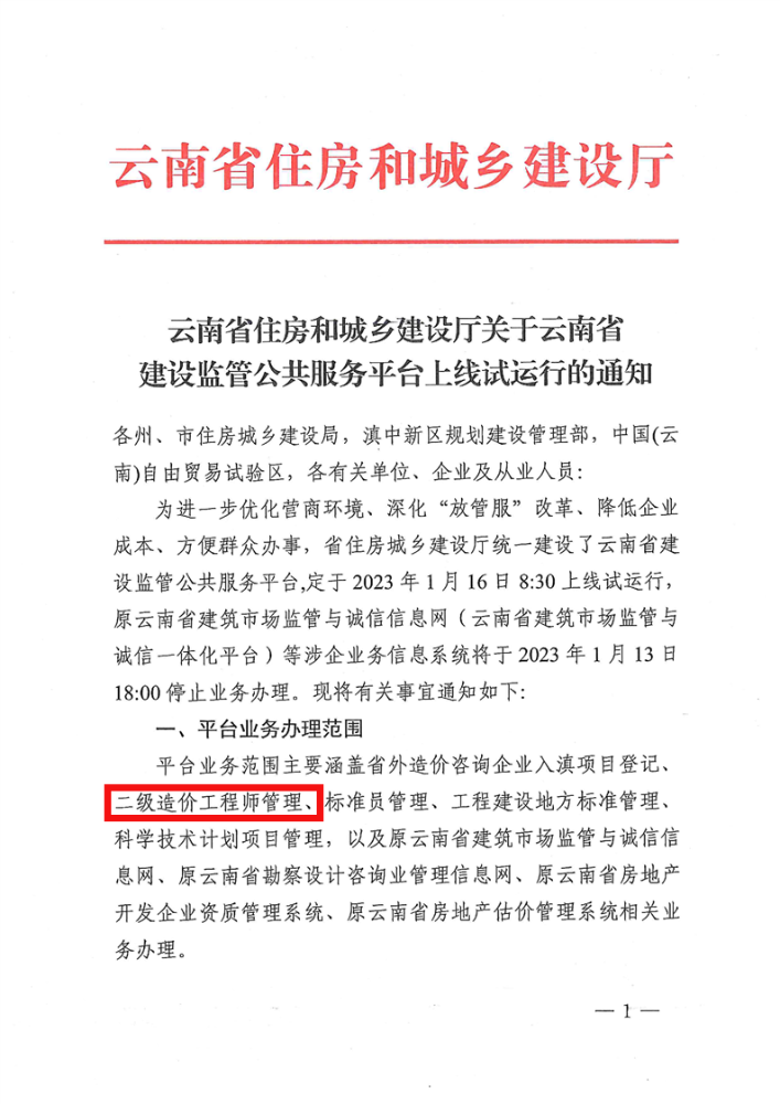 关于云南省建设监管公共服务平台上线试运行的通知,涉及二级造价师