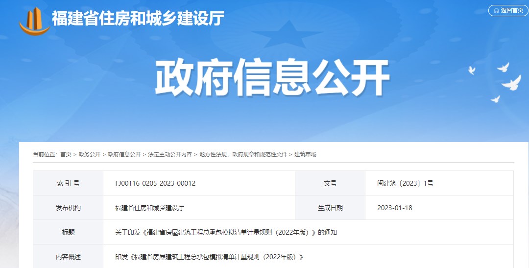 福建发布《福建省房屋建筑工程总承包模拟清单计量规则(2022年版)》