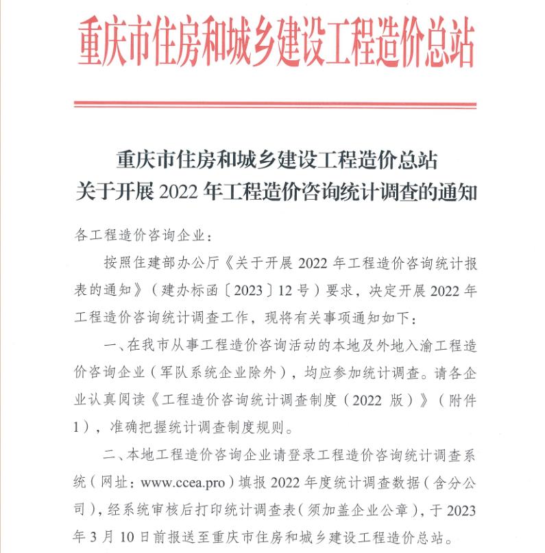 重庆市关于开展2022年工程造价咨询统计调查的通知