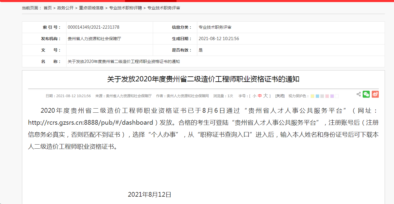 关于发放2020年度贵州省二级造价工程师职业资格证书的通知