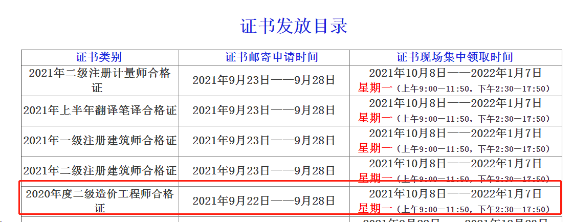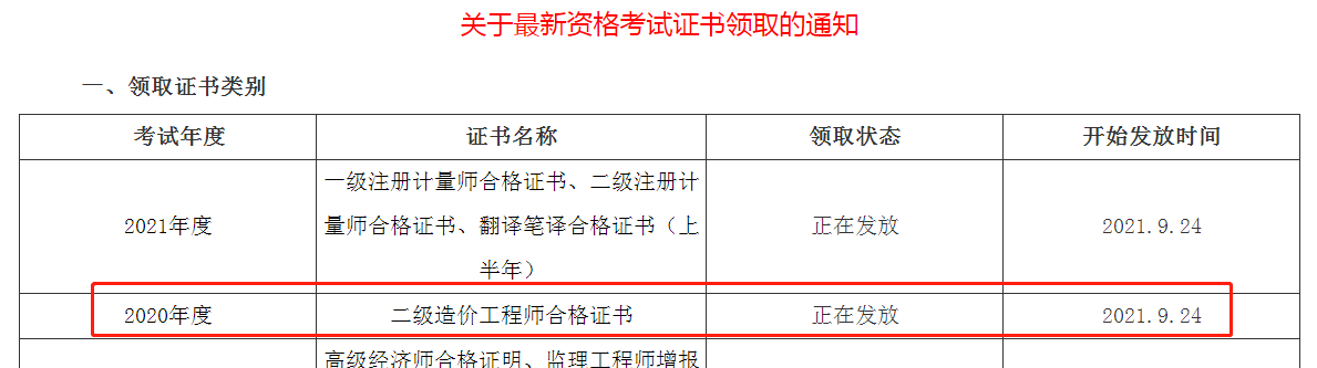 关于2021年度重庆二级造价工程师职业资格证书发放的通告