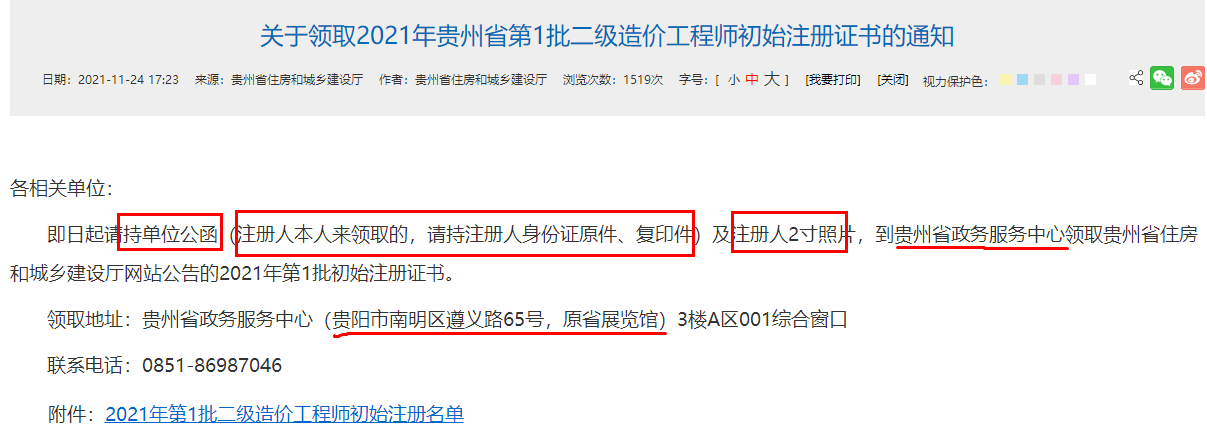 关于领取2021年贵州省第1批二级造价工程师初始注册证书的通知