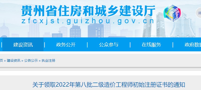贵州关于领取2022年第八批二级造价工程师初始注册证书的通知