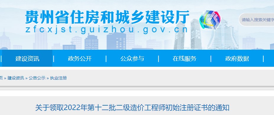 贵州省关于领取2022年第十二批二级造价工程师初始注册证书的通知