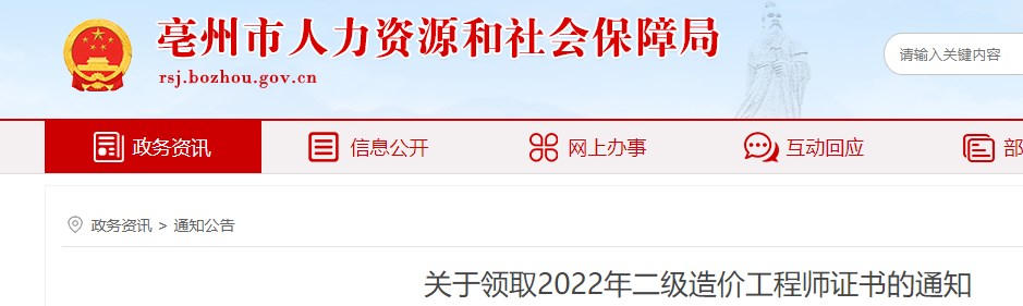 安徽亳州关于领取2022年二级造价工程师证书的通知