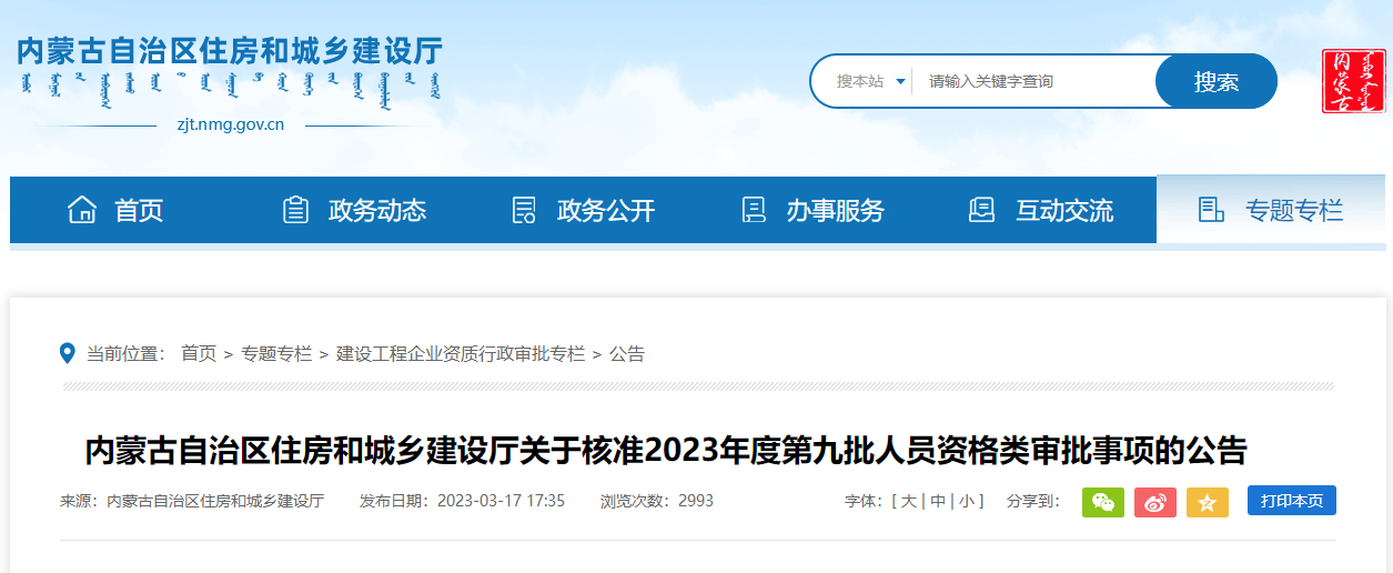 内蒙古自治区住房和城乡建设厅关于核准2023年度第九批人员的公告