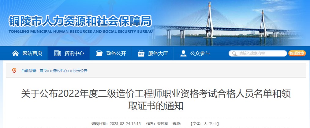 安徽铜陵2023年二级造价工程师考试合格人员名单和领取证书通知
