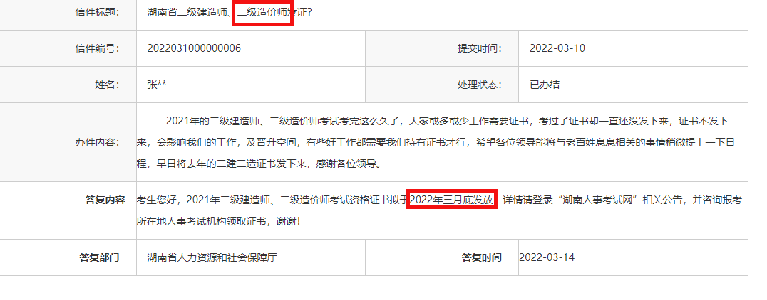 2021年湖南长沙二级造价师考试证书已开始发放,考生自行领取