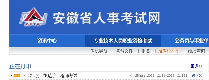 安徽省2022年二级造价师考试准考证打印时间:12月14日-16日