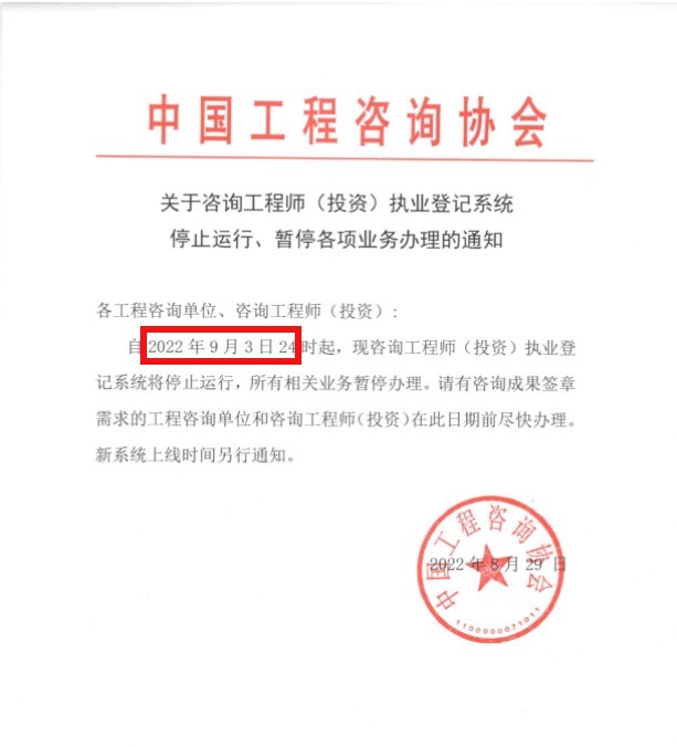 关于咨询工程师(投资)执业登记系统停止运行、暂停各项业务办理的通知